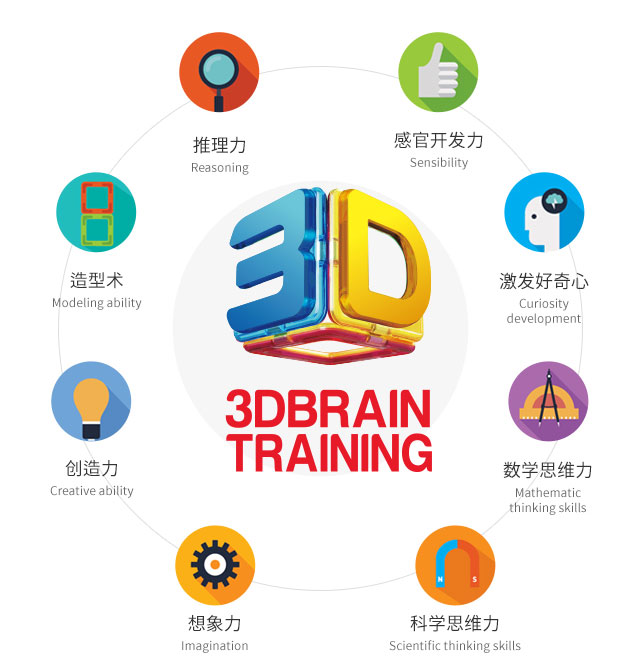 “大脑的3D立体训练”是指造型术、推理能力、 感官开发力、好奇心、创造力、想象力、数学思维力、 科学思维力等8个必须技能不单单偏向于哪一个, 而是有机结合,均衡发展的3D思维,利用这种思维 效果组合出模型,使得孩子在玩耍过程中享受乐趣, 对孩子的健康发展起到积极影响。