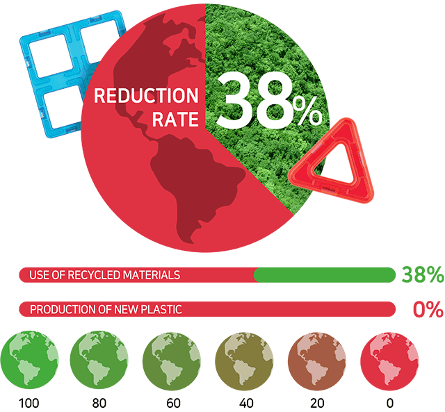 Magformers magnet pieces are currently made of ABS, a synthetic resin that is heat and damage-resistant compared to typical plastic. In the near future, using recycled plastic in the production of Magformers can not only help increase the utilization of waste plastic, but also reduce carbon emissions, contributing to environmental protection.