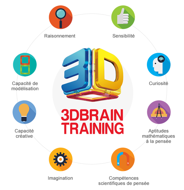 L’entrainement cérébral 3D favorise l'imagination des enfants en les aidant à développer la pensée 3D complète . Magformers aide les enfants à comprendre comment les objets peuvent être construits en passant par des plans en 2D à des structures en 3D .