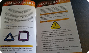 This is the booklet (unfortunately referring to the fake product as “Magformers”). Unlike what is stated in the booklet, genuine Magformers® come in more shapes than just squares and triangles, but the bigger concern is of course the danger associated with the inferior fake product.