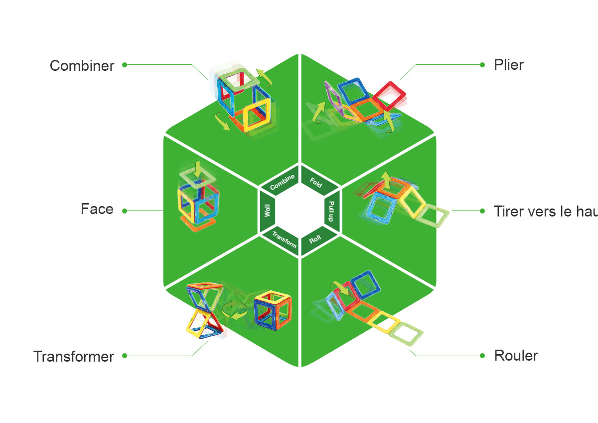 Un aimant à un pôle positif et un pôle négatif et les pôles opposés de l’aimant s’attirent entre eux alors que les mêmes pôles se repoussent. Les aimants en néodyme sont encapsulés à l’intérieur de tout les bord des pièces de Magformers. Cela leur permet de tournent dans toutes les directions et de se connecter les uns des autres, indépendamment de leur position lorsque deux Magformers sont réunis. Par conséquent , Magformers n'a pas été conçu uniquement à des fins d'empilage comme des blocs normaux , il est conçu pour avoir des pouvoirs de connexion incroyables quelle que soit leur direction.